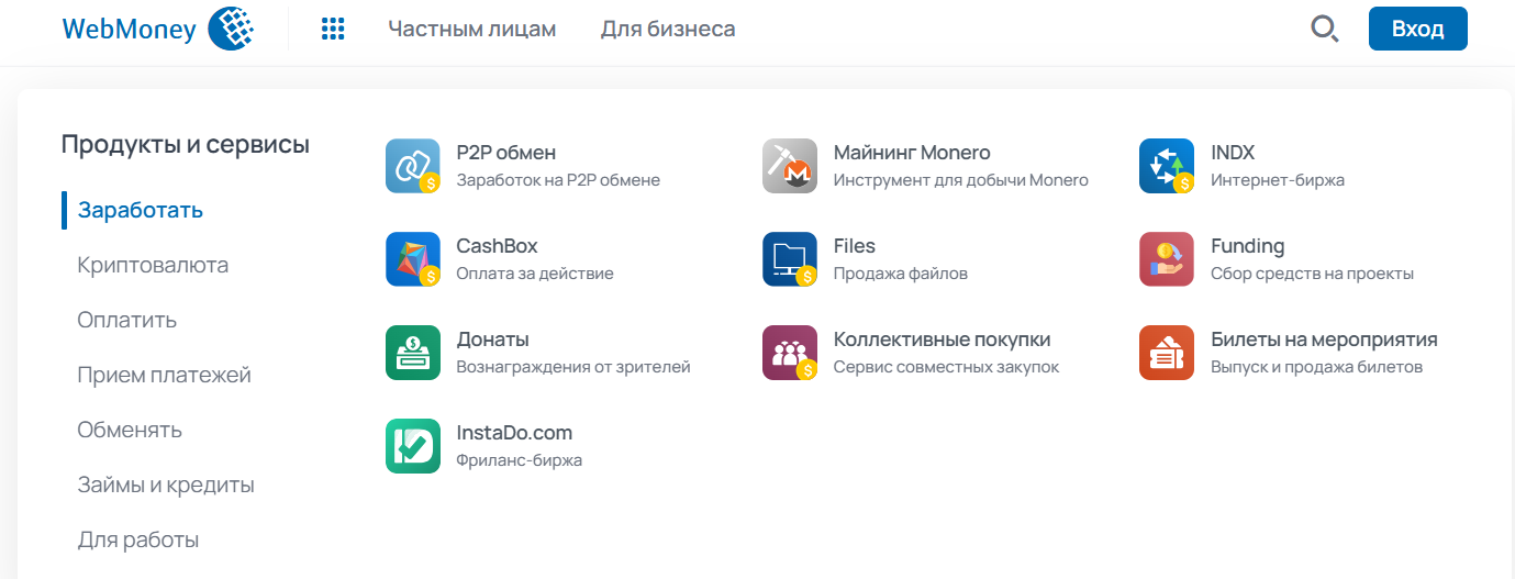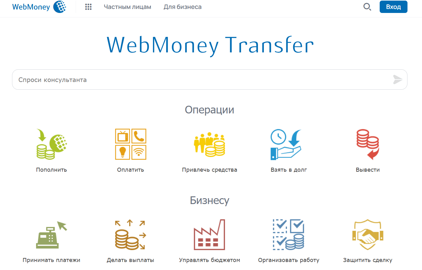 Под брендом WebMoney Transfer работает веб-площадка и она заточена под услуги для частных лиц и бизнеса. Среди основных возможностей предлагаются следующие опции: