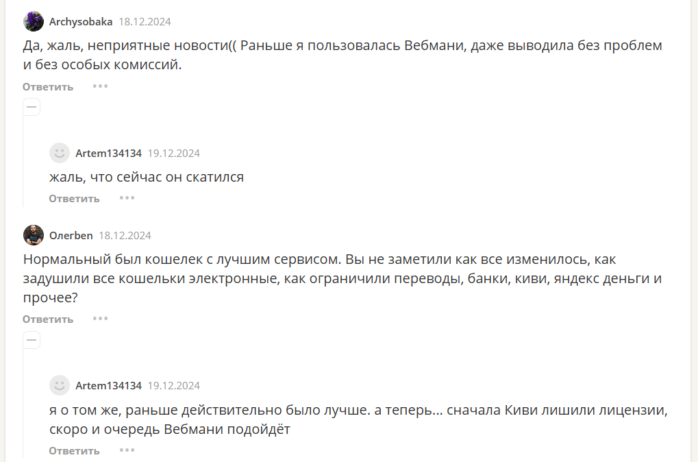На интернет-форумах отзывы о «Веб Мани» встречаются разнообразного содержания, но заметно, что положительные писались давно. Более свежие комментарии за 2024-2025 в большинстве своем негативные. В них пользователи отмечают, что сервис скатился по уровню честности и доступности.