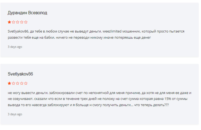 Отзывы о WeezLimited отрицательные. За такой короткий срок работы многие пользователи уже успели попасться в ловушку мошенника. Многие столкнулись с тем, что не могут вывести деньги. Счет блокируют по непонятной системе и не объясняют причину. Поддержка не отвечает, но рассылки приходят. Брокер угрожает тем, что если пользователь не положит нужную сумму на счет, то его заблокируют навсегда и деньги исчезнут. Некоторые клиенты рассказывали похожие истории.