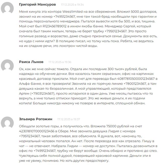 На форумах и в социальных сетях активно обсуждаются случаи, когда после внесения дополнительных средств на «ВеезЛимитед», сумма на счету пользователя внезапно обнуляется, а сам аккаунт становится недоступным. Вся схема направлена на выманивание денег под предлогом инвестиций, а реальной торговой деятельности или возможности заработка не существует. Отсутствие лицензии и регистрации в авторитетных финансовых органах лишь подкрепляет подозрения в недобросовестности компании.