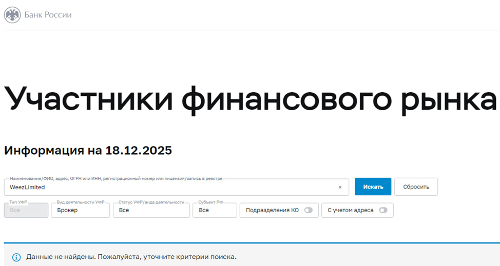 Weez Limited обязан иметь лицензию Центрального банка РФ, как и любой другой брокер. Но на сервисе не указан ни один документ, который доказал бы легальность платформы. В реестре Центробанка РФ обозреваемая нами площадка не числится. Значит, пользователям очень опасно пользоваться услугами этого брокера. Он работает нелегально, и клиент станет соучастником нарушения закона. Все данные, которые трейдеры предоставляют компании, могут быть использованы в мошеннических целях.