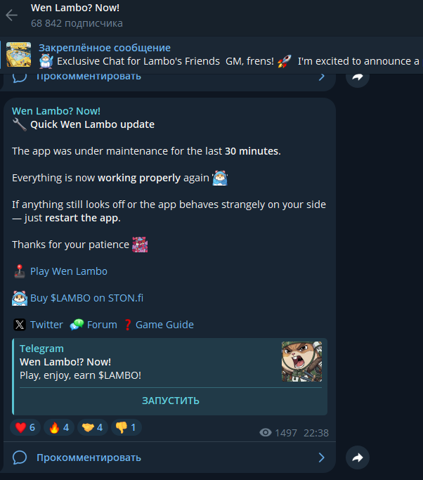 Реальный интерес к Wen Lambo Bot уже угас, поэтому владельцам, видимо, приходится искусственно добавлять пользователей в бот. Об этом можно догадаться, если обратить внимание на активность в официальном канале. Тут при почти 70 тысячах подписчиков по 1-2 тыс. просмотров и 0 комментариев.