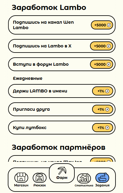 Коины можно получить и другими методами, например, в разделе “Задания”. Тут есть как единовременные, так и ежедневные квесты. Часть из них связана с Вен Ламбо, остальные с проектами партнеров. Обычно придется подписываться на сообщества или же запускать ботов: за это платят по несколько тысяч монет.