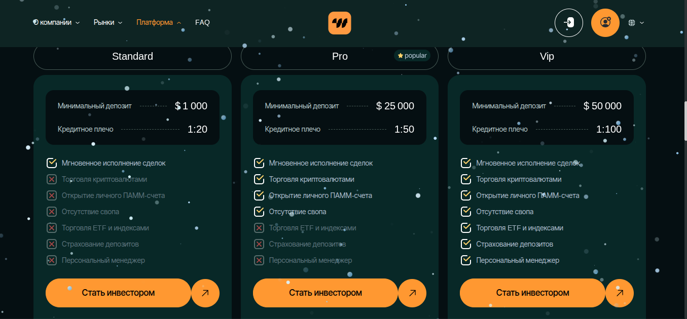 • VIP. Депозит от 50 000 долларов. Кредитное плечо — 1 к 100. Набор услуг максимальный: криптовалюты, ПАММ-счет, торговля ETF и индексами, страхование депозитов и персональный менеджер.