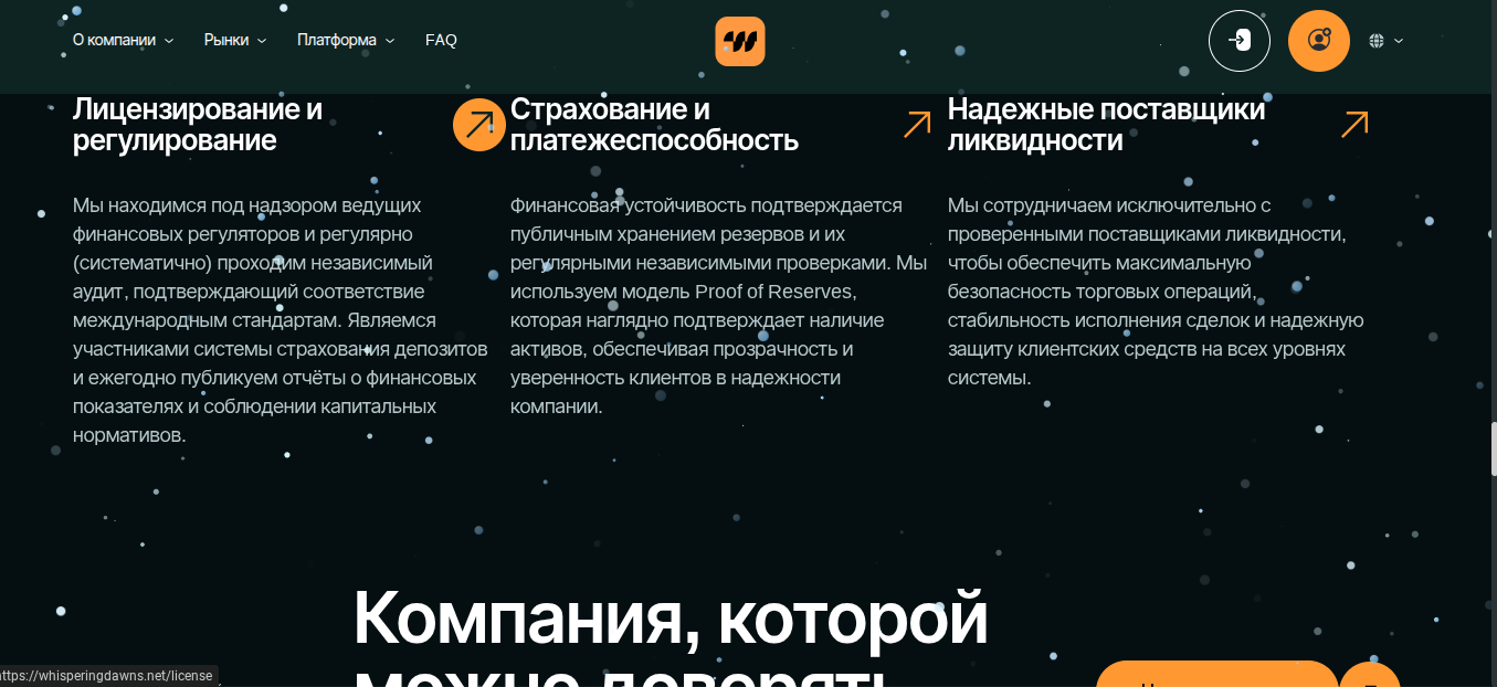 • Страховка и ликвидность. Платежеспособность у биржи WhisperingDawns net максимальная за счет значительных валютных резервов.