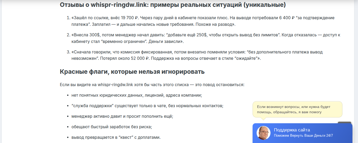 • Репутация негативная. Бывшие трейдеры в негативных отзывах о проекте Whispr Ringdw link пишут про раскрутку счета.
