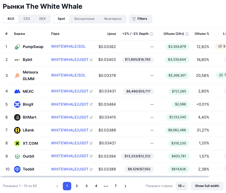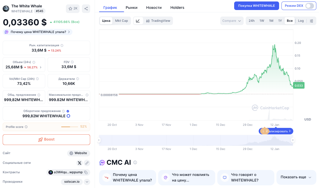 На 21 января 2026-го года курс токена WhiteWhale составляет 0,336 USDT. Капитализация крипты, согласно данным CoinMarketCap, равняется 33,6 миллионам долларов.