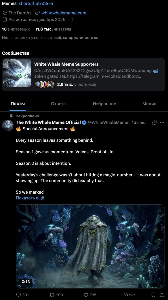 Единственный аккаунт эмитентов криптовалюты, mem-coin в соцсетях — это страница The White Whale Meme Official в Twitter. На нее на 21 января 2026-го года подписаны 11,8 тысяч читателей.