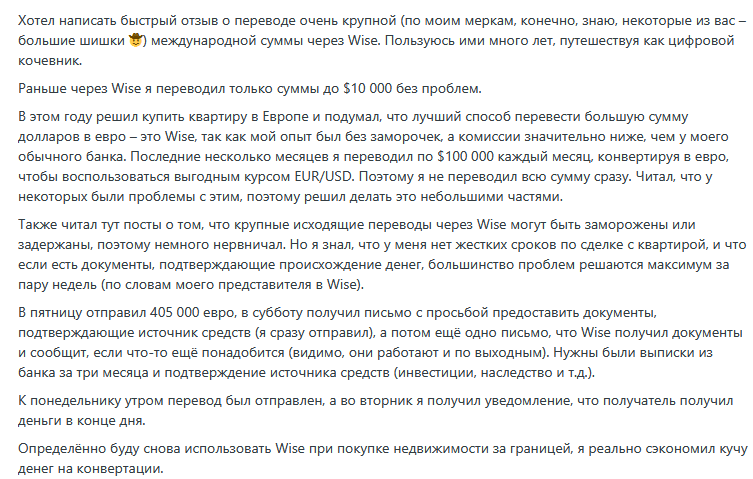 В сети довольно много независимых отзывов о Wise. Часть комментариев хорошая, клиенты говорят о выгодных курсах обмена и низких комиссиях. Также отмечается возможность перевода средств за границу для оплаты недвижимости. Компания просит предоставить документы, которые подтверждают легальность денег. На рассмотрение и перевод уходит минимум времени.