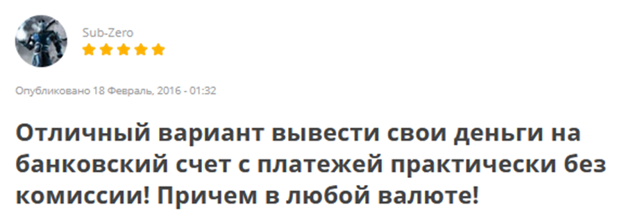 По словам клиентов, вывод доступен практически в любой валюте. Комиссии очень низкие, деньги можно получить на карту или счет в банке.