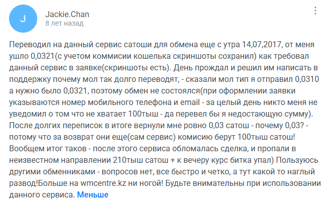 Негативных отзывов намного меньше. Пользователь с ником Jackie.Chan сообщил, что с его обменом вышла неприятная ситуация из-за курса, ему пришлось доплачивать, а в итоге он потерял некоторое количество цифрового актива, поэтому считает обменник «ВМСентре» разводом.