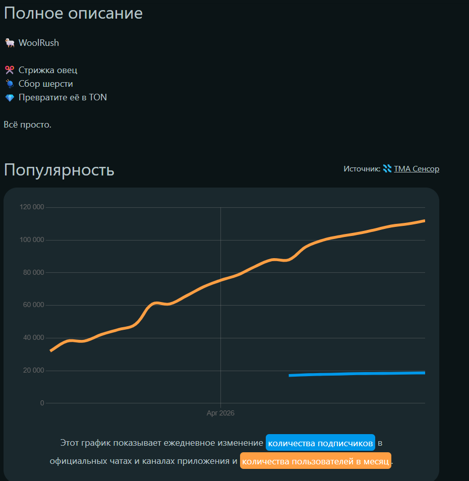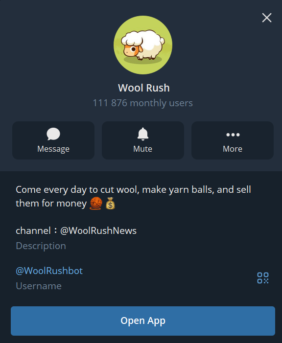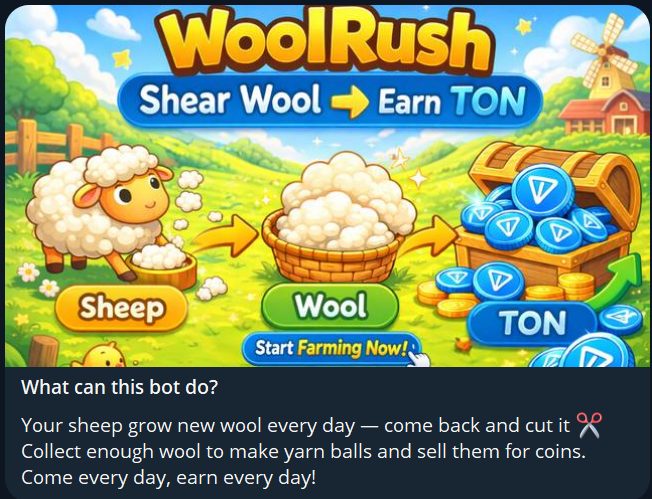 Wool Rush – это телеграм-приложение, которое создано в блокчейне TON. Пользователи взаимодействуют с виртуальными овцами путем ежедневного сбора ресурсов шерсти, ее переработки и последующего обмена на TON. Создатель проекта остается анонимным.