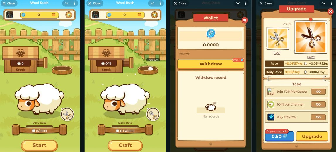 Wool Rush предлагает каждый день стричь виртуальных овец. Игроки делают это специальными ножницами и собирают шерсть, которая копится в течение дня. Затем ее можно переработать в пряжу, которую продают за TON по курсу: 1000 единиц шерсти равняется 1 TON.