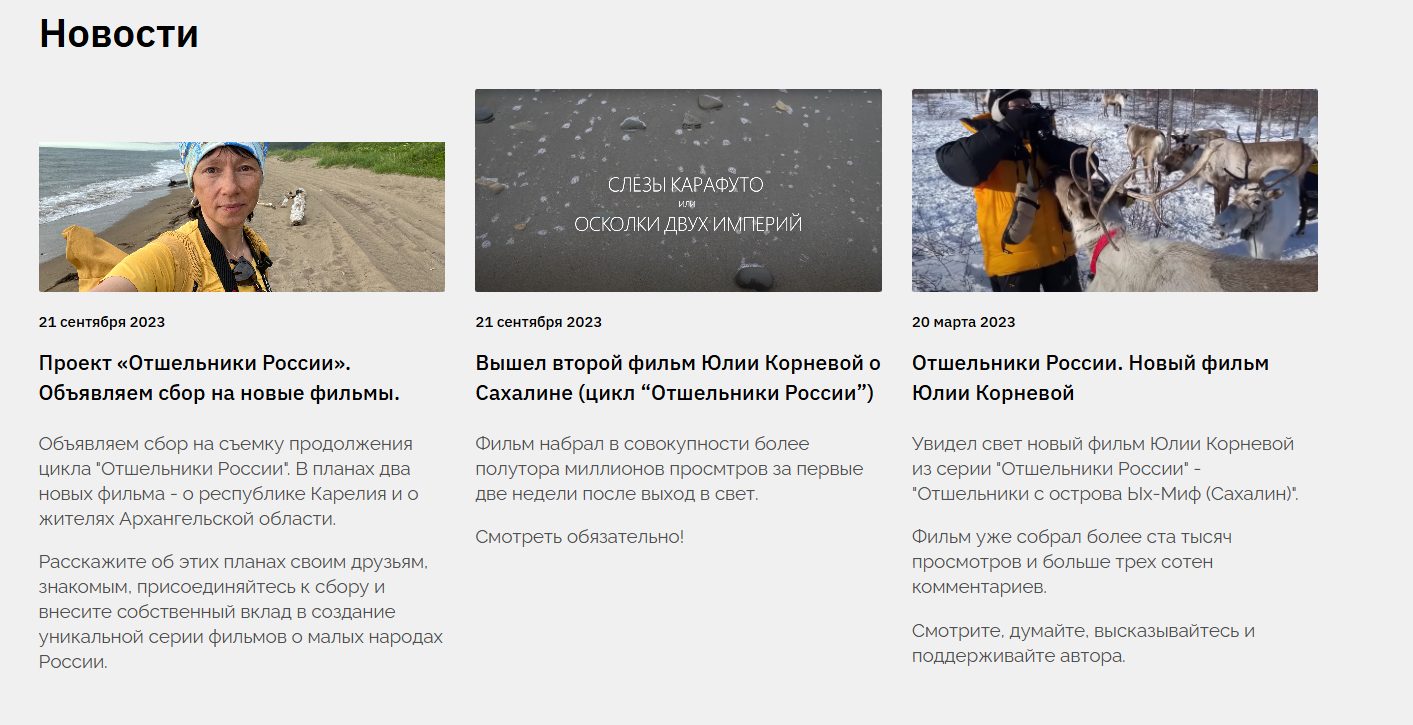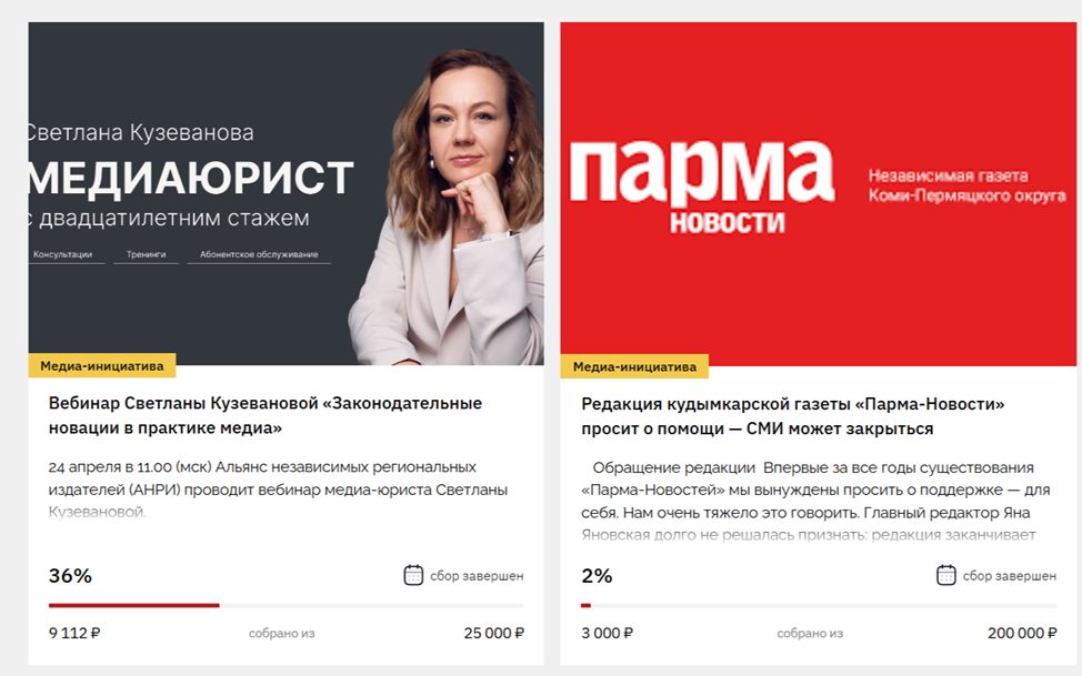 Последняя новость на сайте была в 2023 году. После этого не появилось ни одного обновления, что говорит об отсутствии новых проектов. Активные кампании сведены к двум проектам с низким прогрессом: вебинар юриста собрал всего 36% от цели в 25 000 рублей. Сбор для спасения газеты «Парма-Новости» достиг лишь 2% от 200 000 рублей.