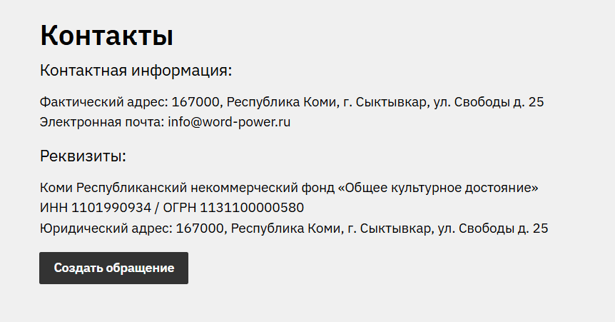Контактные данные «Силы слова» включают электронную почту info word power ru. Организация расположена в Республике Коми, город Сыктывкар. Телефонных номеров не указано, формы обратной связи нет. Социальные сети представлены ссылками на группу ВКонтакте под названием word power crowdfunding и тг-канал journ platform.
