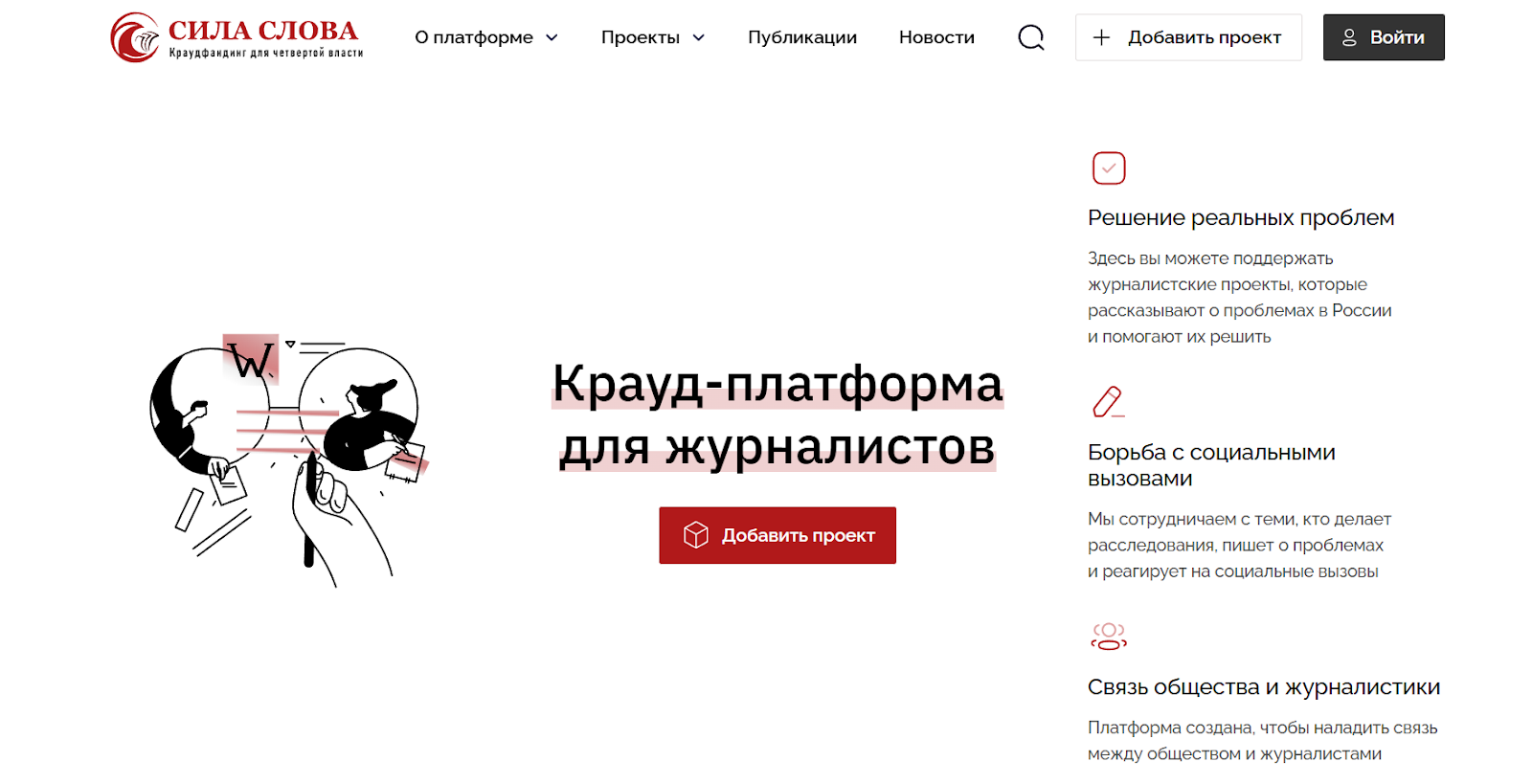 «Сила слова» – это проект, который создан для сбора денежных средств на реализацию журналистских потребностей. Сервис позволяет некоммерческим организациям размещать заявки на финансирование расследований или помощи коллегам.