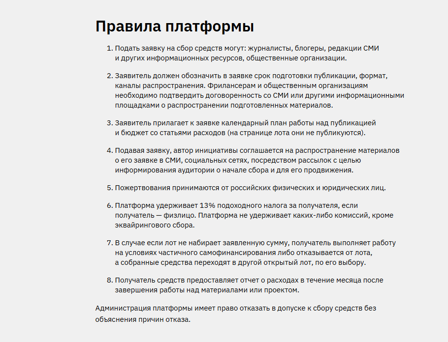 Платформа выступает налоговым агентом и обещает работать в правовом поле. Однако нет договоров оферты с обязательствами или страхования средств. Проекты не набирают суммы годами, материалы не публикуются, а донаторы не получают подтверждений использования средств.