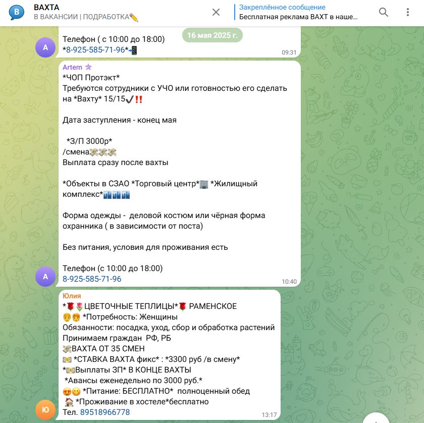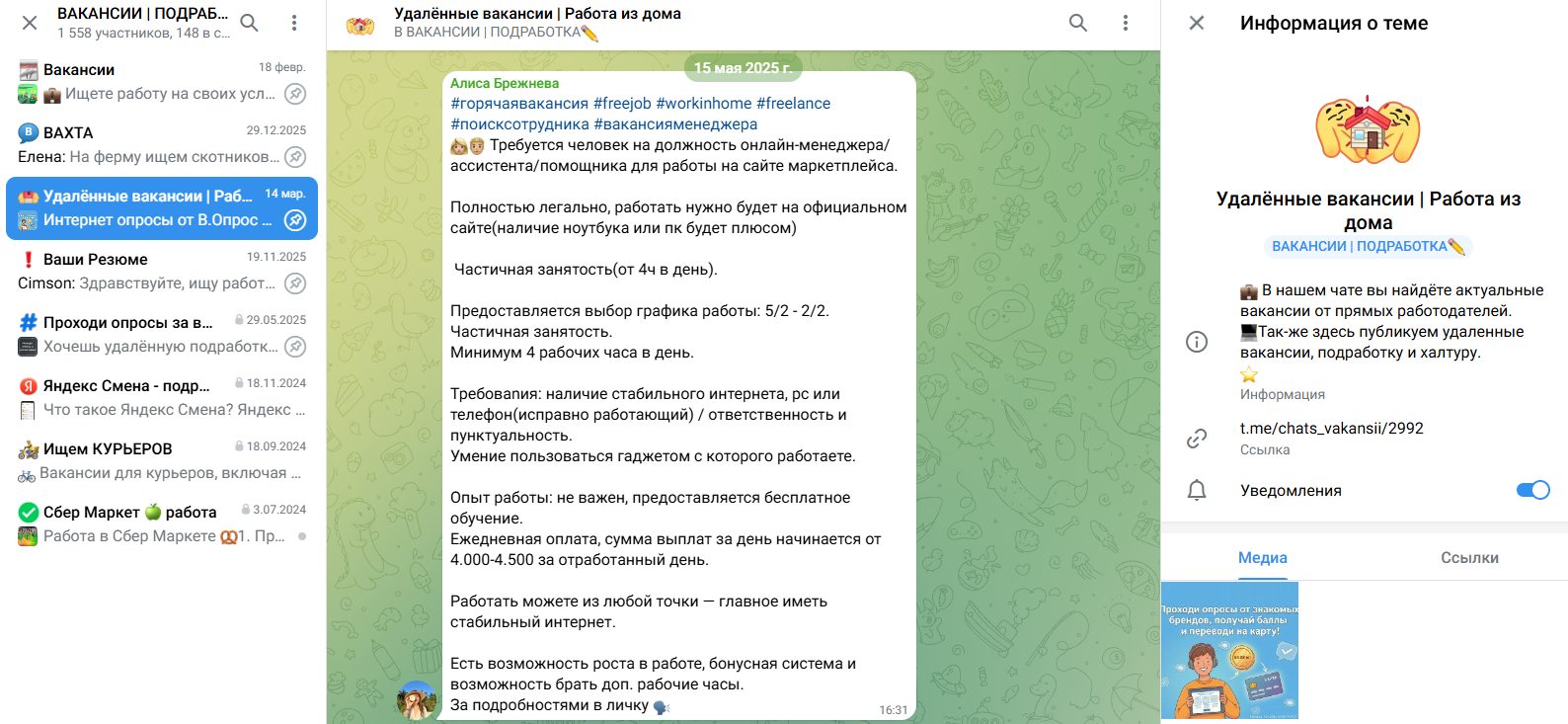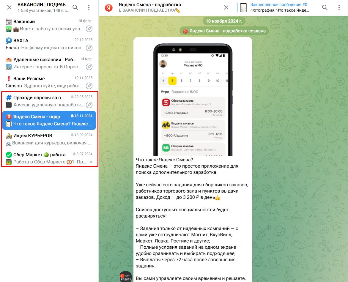 Реальные и разнообразные вакансии люди могут узнать в группе “ВАКАНСИИ | ПОДРАБОТКИ”. При этом неизвестно, управляют ли ими разработчики Work Kuper Yandex Bot, но команда делится ссылкой именно на этот проект. Внутри есть удобная структура для поиска необходимой работы: