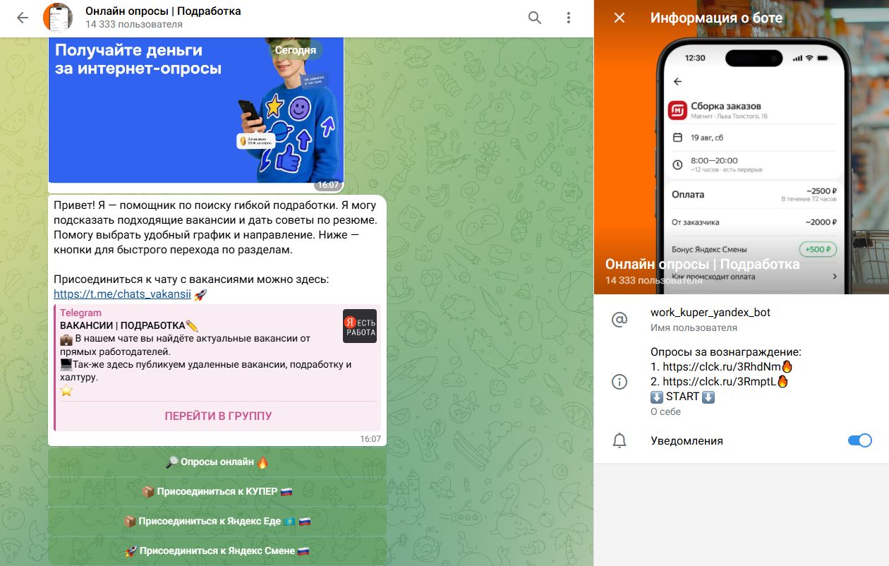 Телеграм бот Work Kuper Yandex Bot отзывы в интернете не собирает, а команда предлагает различные способы для полноценного заработка или подработки. Также владельцы ведут канал, где предлагают вакансии для трудоустройства: от разовых смен до вахты на 35-90 дней. Однако нанимают людей обычные пользователи, не компании. Можно ли доверять боту Онлайн Опросы | Подработка, узнаете в данной статье.