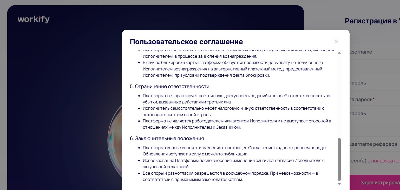 Владельцы утверждают, что проект выступает в качестве посредника между рекламодателями и исполнителями заданий, а смысл заключается в том, чтобы перевести деньги на карту пользователя и ожидать начисления вознаграждения. О создателях сайта нет никакой информации, поэтому и о гарантиях с их стороны говорить не стоит, ведь на Workify cc выложено «Пользовательское соглашение», где написано про отсутствие ответственности за действия третьих лиц.