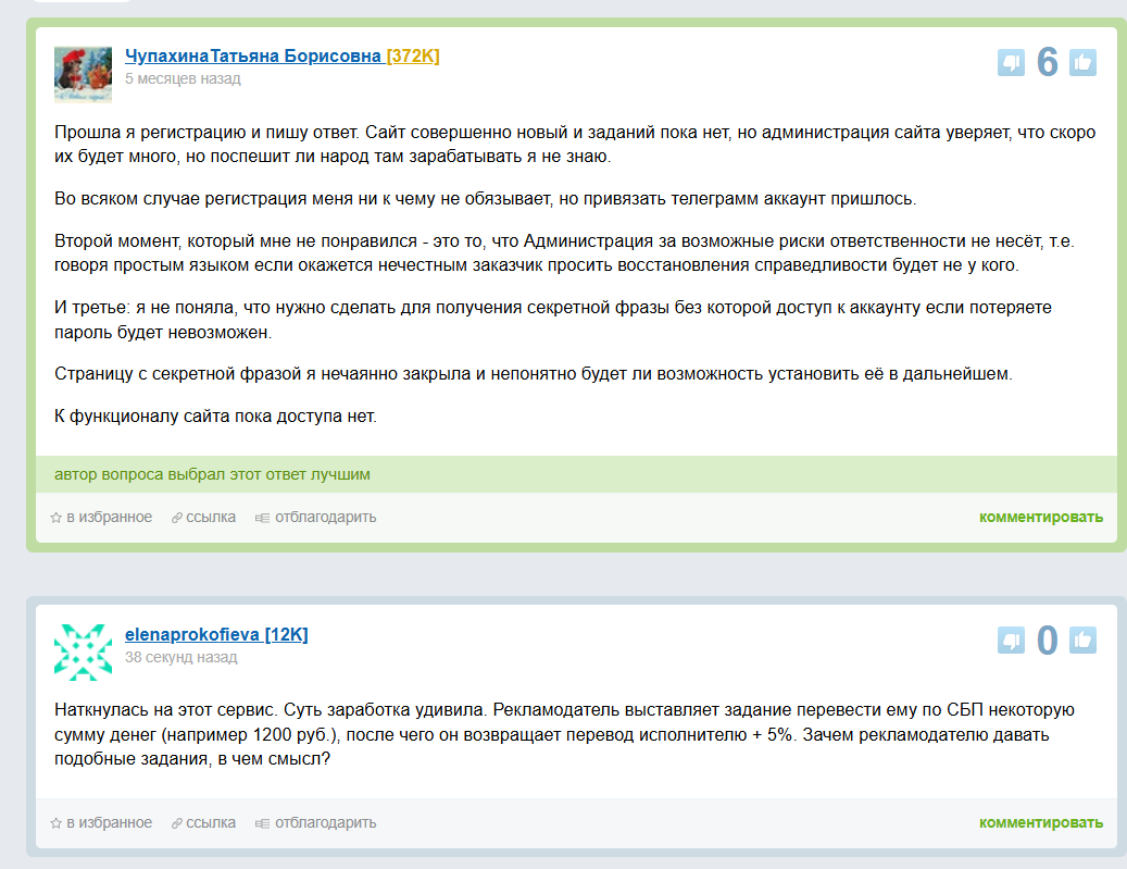- Практически полное отсутствие публичных отзывов от реальных исполнителей ставит под сомнение заявленную активность и факт выплат на платформе.