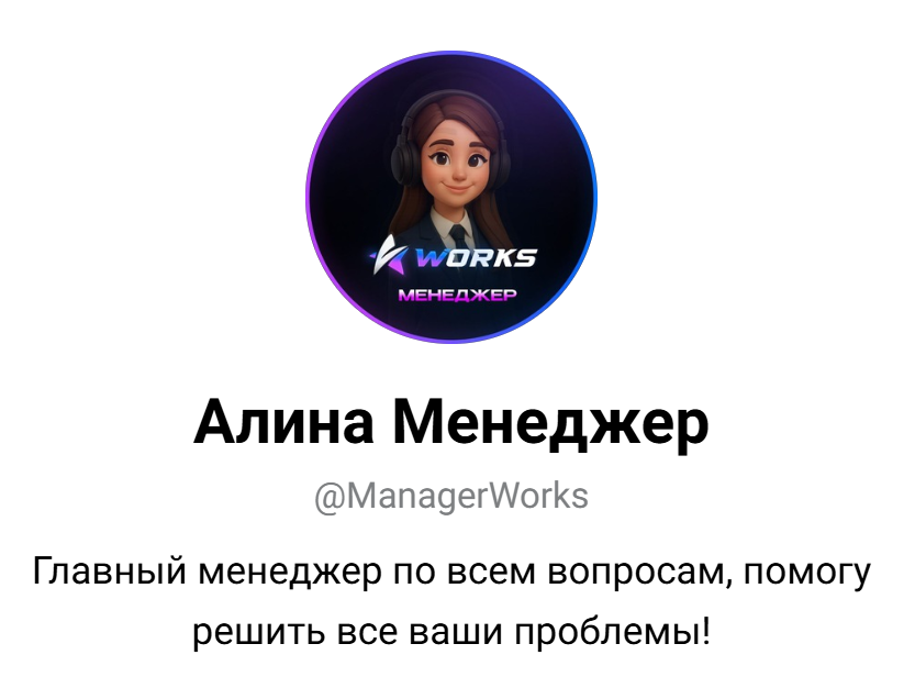 Связь с разработчиками бота поддерживалась через профиль Алина Менеджер. Он доступен по ссылке ManagerWorks. В описании говорится, что специалист помогает в решении всех проблем. По факту связаться с представителем компании не удается.