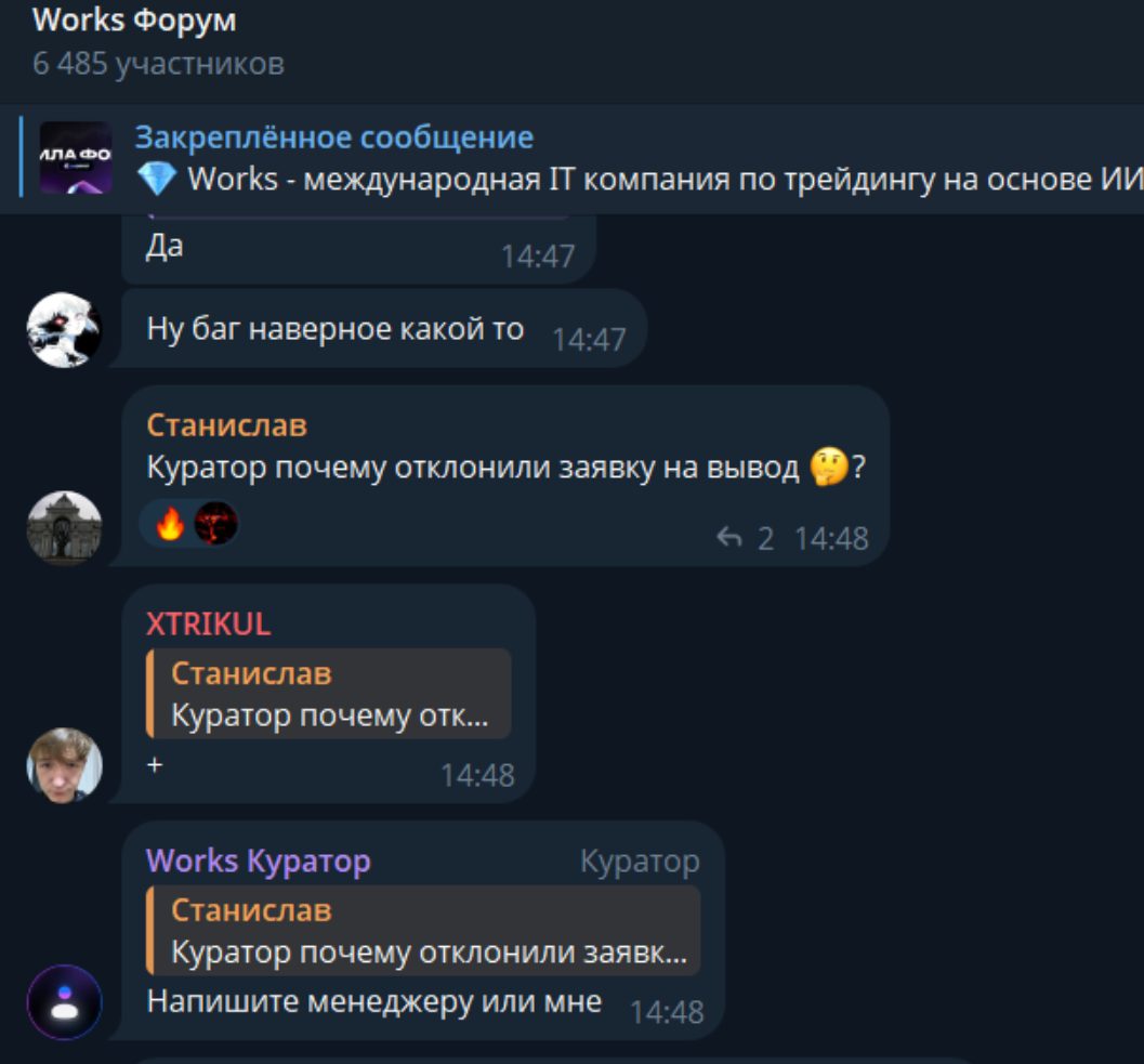 Ранее для общения участников был доступен форум Works App в Telegram. На момент активности к нему было подключено около 6,5 тыс. пользователей. На начало декабря 2025-го данный чат вовсе не доступен. Ранее клиенты жаловались на невозможность вывода денег и другие проблемы.