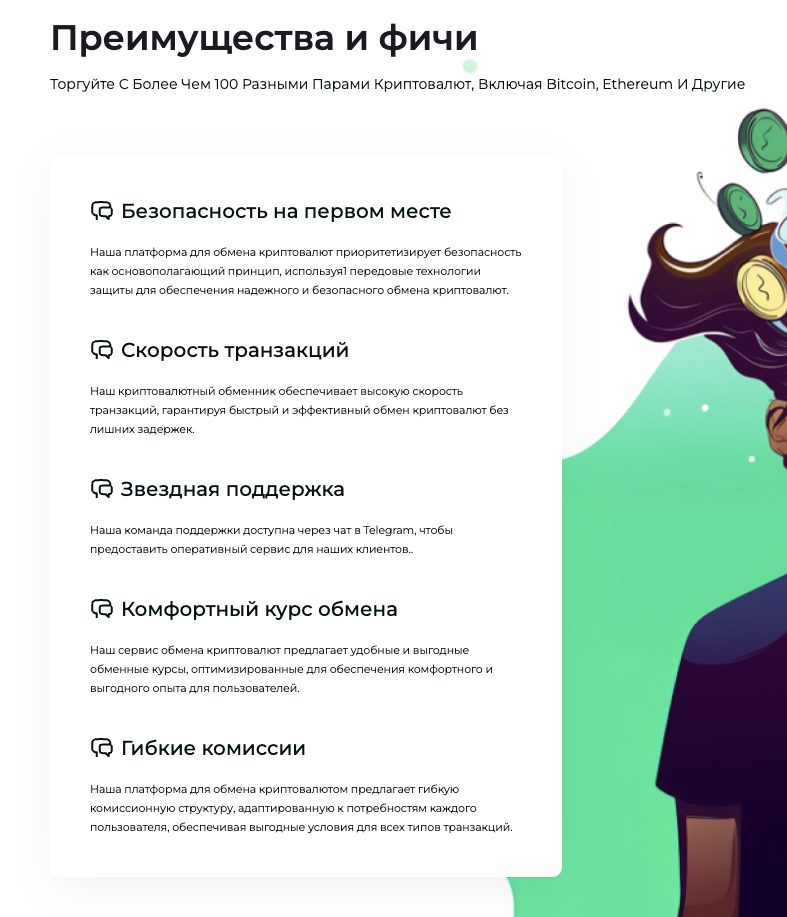 В качестве преимуществ платформы указаны высокая скорость транзакций и гибкие комиссии. Их наличие в перечне достоинств выглядит странно, так как сроки перевода и размеры сборов регулирует блокчейн, а не владельцы обменника.