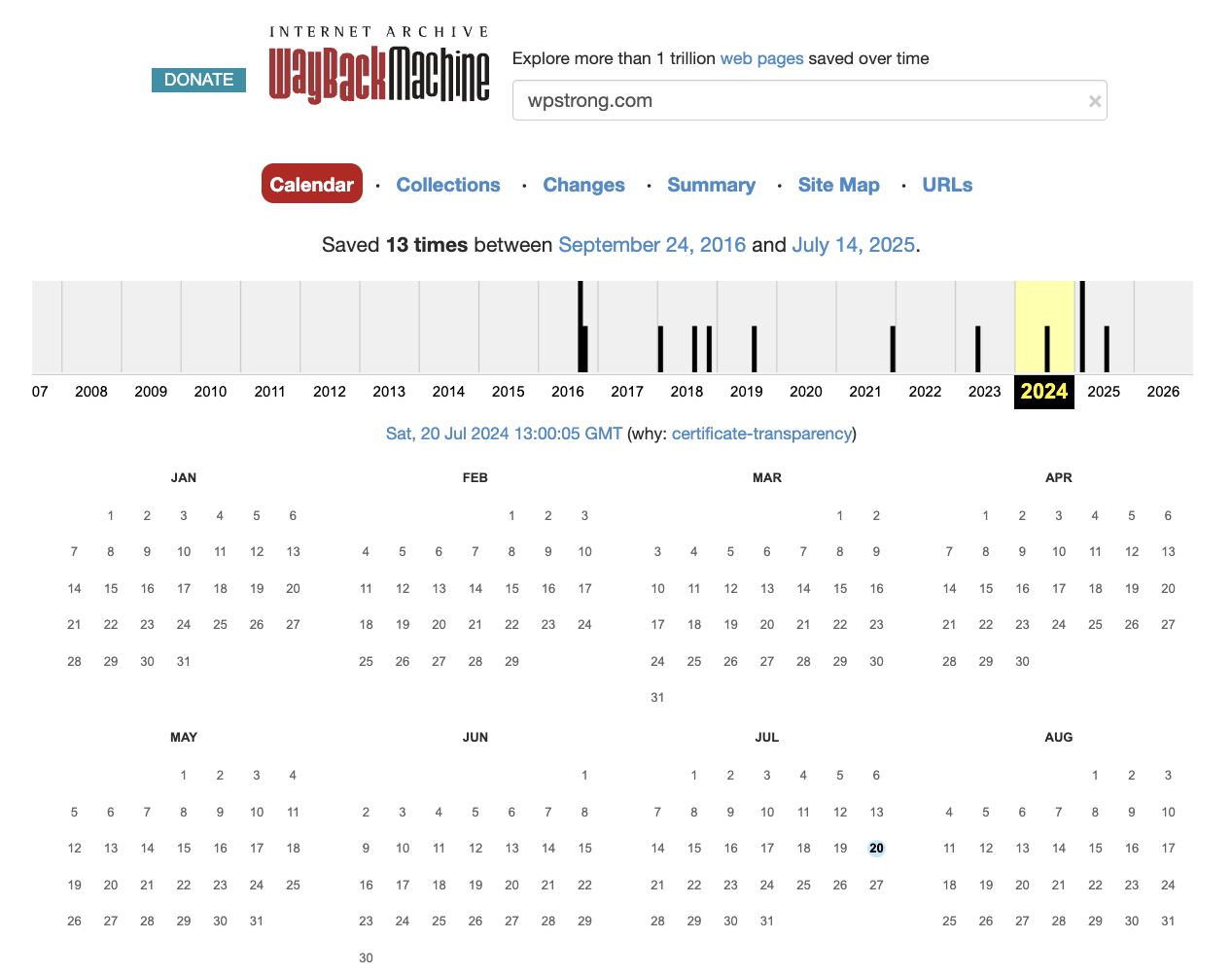 Мы запросили снимки сайта wpstrong com из WayBack Machine, и узнали, что последний снэпшот данный сервис зафиксировал в середине 2025-го года. Ни этот, ни другие снимки ресурса не открываются.