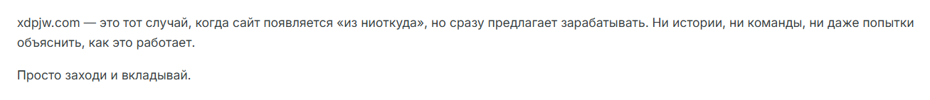 Поделитесь в комментариях, как вы оцениваете такие инвестиционные предложения, как на сайте Xdpjw com.
