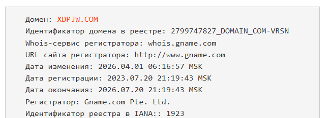 Несмотря на отсутствие данных, проверка домена Xdpjw com показала, что последние изменения в него внесли 1.04.2026, а это может означать появление нового владельца.