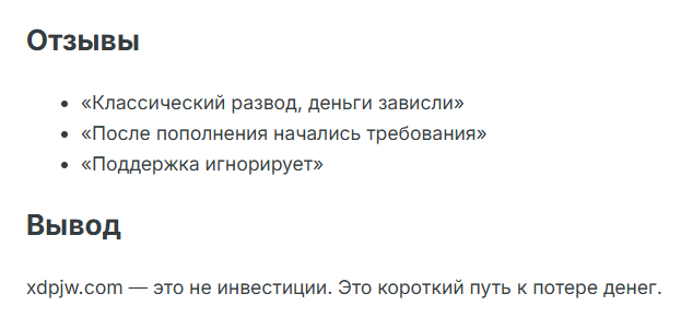 Даже несмотря на постоянную смену владельцев, упоминаний о площадке в сети довольно мало, но в тех отзывах об Xdpjw com, которые удалось найти, говорят про развод.
