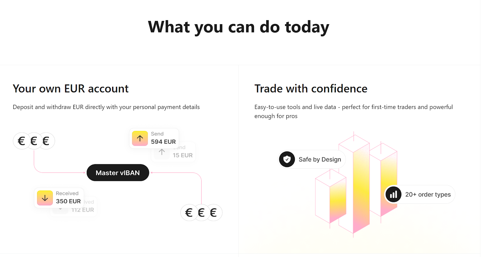 Пользователи могут мгновенно конвертировать евро в криптовалюту и обратно. Сервис обеспечивает вход в Web3 через пополнение внешних кошельков, оплату услуг и вывод заработанных средств. В приложении доступны функции покупки, хранения, торговли и траты криптовалюты в интерфейсе.