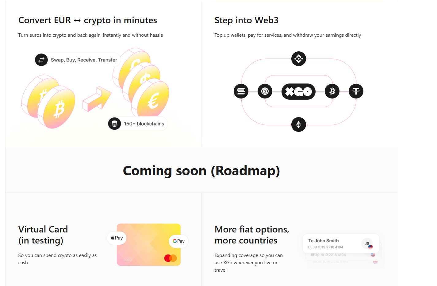 Платформа предлагает смарт-торговлю с профессиональными инструментами, а также быстрые переводы и конвертации за минуты. Поддерживается прозрачное ценообразование без скрытых платежей. Виртуальная карта XGo находится в стадии тестирования с планами расширения вариантов оплаты и стран покрытия.