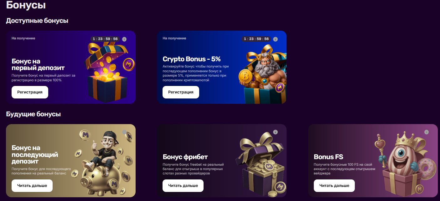 Платформа активно предлагает различные акции новым пользователям. Первая – бонус 100% на первый депозит. Вторая – Crypto Bonus 5% при внесении средств криптовалютой. Также обещают фрибет и 100 бесплатных фриспинов. На первый взгляд звучит как серьезное преимущество. Но тут есть важные нюансы.