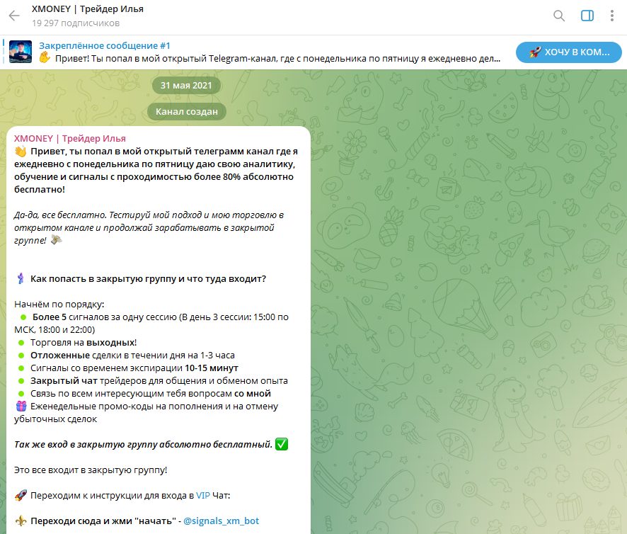 Телеграмм-канал трейдера называется «XMoney | Трейдер Илья», он был создан в мае 2021 года и работает больше 4,5 лет. Изначально проект принадлежал одному человеку, так как не наблюдается частых изменений названия или контактов, публикации оформлены в едином стиле. В начале 2026 года за ресурсом следит около 20 000 человек, что заочно позволяет называть трейдера известным.