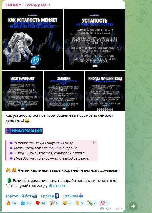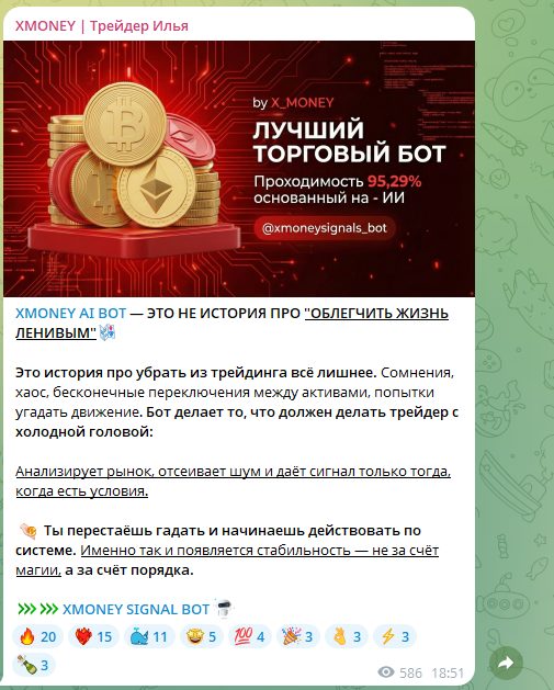 Мотивационный контент помогает привлечь внимание аудитории к платным продуктам, среди которых XMoney AI Bot. Это приложение предоставляет сигналы для торговли, но они не совсем бесплатные, так как для доступа к системе нужно подписаться на канал и зарегистрироваться по реферальной ссылке.