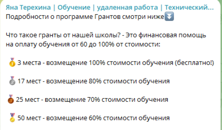 Для мотивации своих подписчиков специалистка делает специальное предложение о розыгрыше грантов на обучение. Призеры получают скидку на курсы, а тройка победителей заберут программы бесплатно.