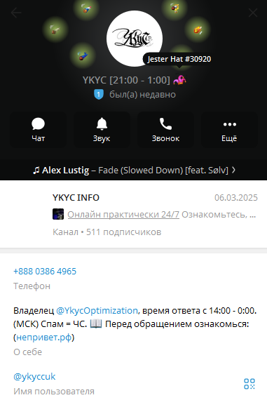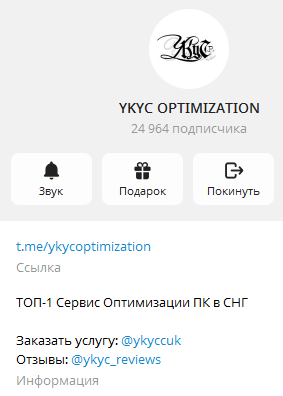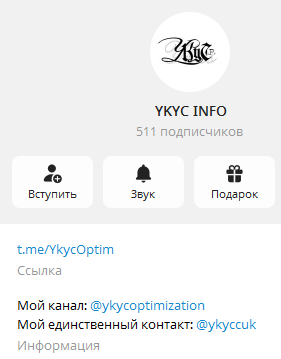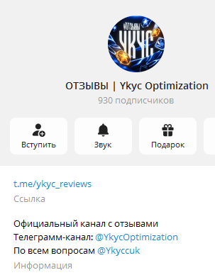 Создатель программного пака «YKYC 21 00 1 00» также владеет группой в TG под названием YkycOptim. В телеграм-клуб входит 511 пользователей. В профиле сообщества YKYC INFO размещены ссылки на основной канал и аккаунт владельца.