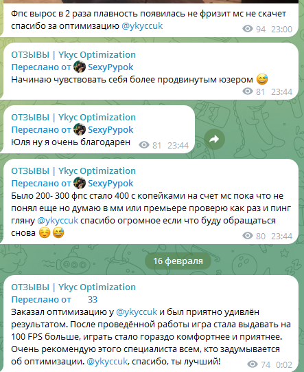 Мастер по компьютерам предлагает изучить фидбек о своей работе, посетив сообщество Ykyc reviews. На официальном канале с отзывами размещаются положительные отклики клиентов «Укуса». Юзеры утверждают, что PC эксперт реально помог с настройкой оборудования, и теперь игры «летают», «комп не тормозит», и все очень довольны.