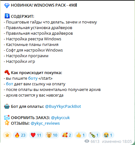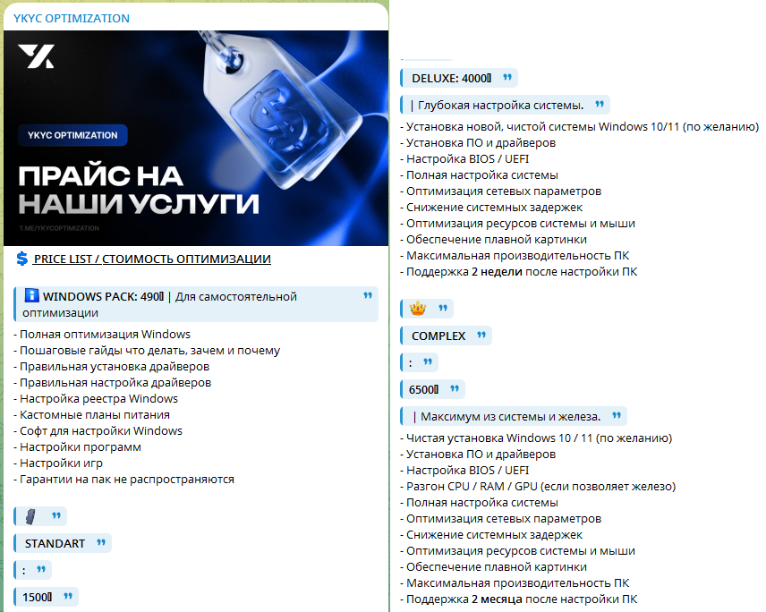 Специалист по оптимизации ПК мастер «Укус» занимается настройкой операционной системы «Виндовс», настраивает драйверы системы и меняет опции в реестре, устанавливает программные продукты и, конечно же, занимается настройкой игр. Основатель online сервиса обещает изменить в лучшую сторону «картинку», повлиять на ФПС, добиваясь улучшения параметров. Покупка услуг специалиста Ykyc Optimization осуществляется в Телеграме через бота.