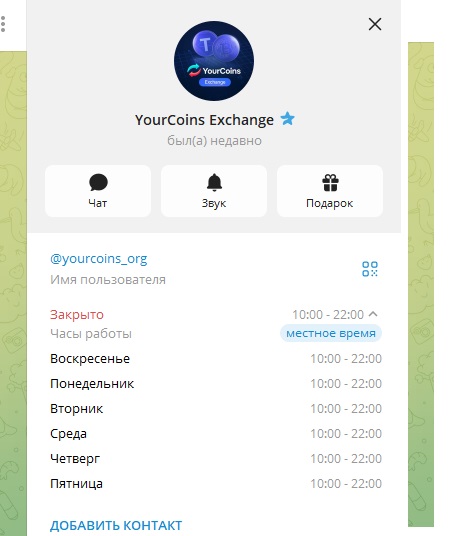 В числе основных преимуществ платформы владельцы называют анонимность обменов, быстрые и безкомиссионные транзакции, круглосуточную поддержку. Но для связи с оператором предоставлен только Телеграмм-аккаунт YourCoins Exchange @yourcoins_org, а там указан график работы с 10 до 22 по МСК.