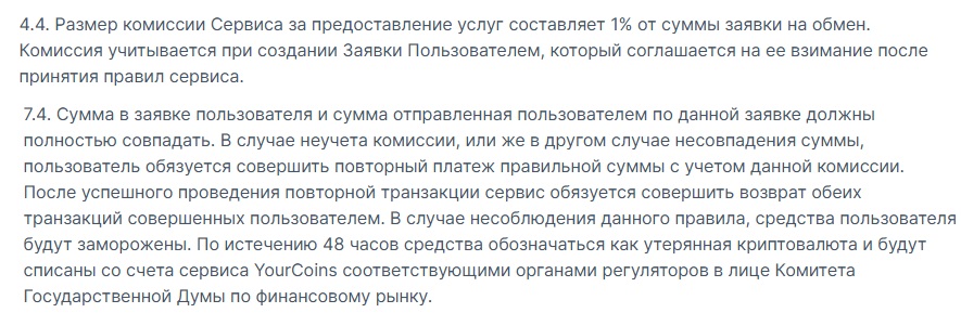 Последний пункт подан противоречиво. Данные на главной странице сайта и в Правилах отличаются. Там указано, что комиссия обменника составляет 1%, а при любом несовпадении суммы из-за “неучета комиссий” пользователь обязан внести повторный платеж уже в полном объеме. После этого, средства обещают вернуть. При отказе платить средства замораживаются и через 48 часов считаются утраченной криптовалютой. Такая процедура якобы утверждена Госдумой, что является абсолютным фейком. По сути, заявка о безкомиссионных транзакциях — ловушка и формальный повод для удержания средств.