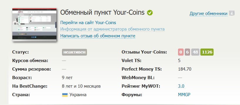Название выбрано не случайно, очевидно, что владельцы пытаются создать ассоциацию с действующим украинским обменным пунктом your-coins.com Он работает с января 2017 года и уже больше 8 лет присутствует на агрегаторе BestChange.