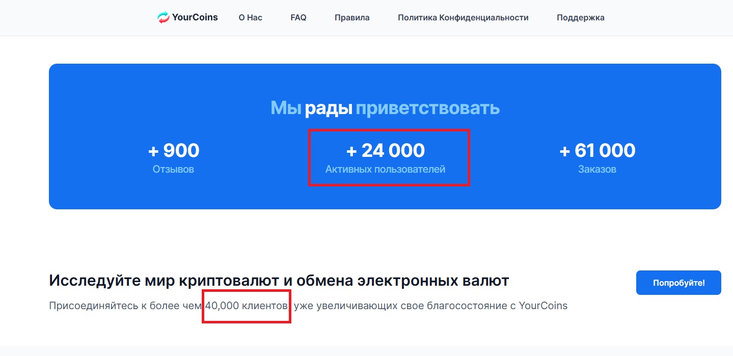 Все статистические данные, которые приводят в описании владельцы YourCoins exchange соответствуют показателям оригинальной площадки: восьмилетний опыт работы, 900+ отзывов, большое количество постоянных пользователей и десятки тысяч обменов.