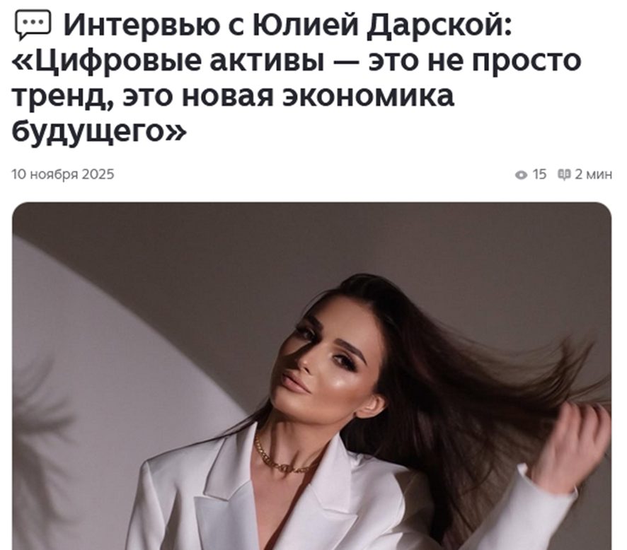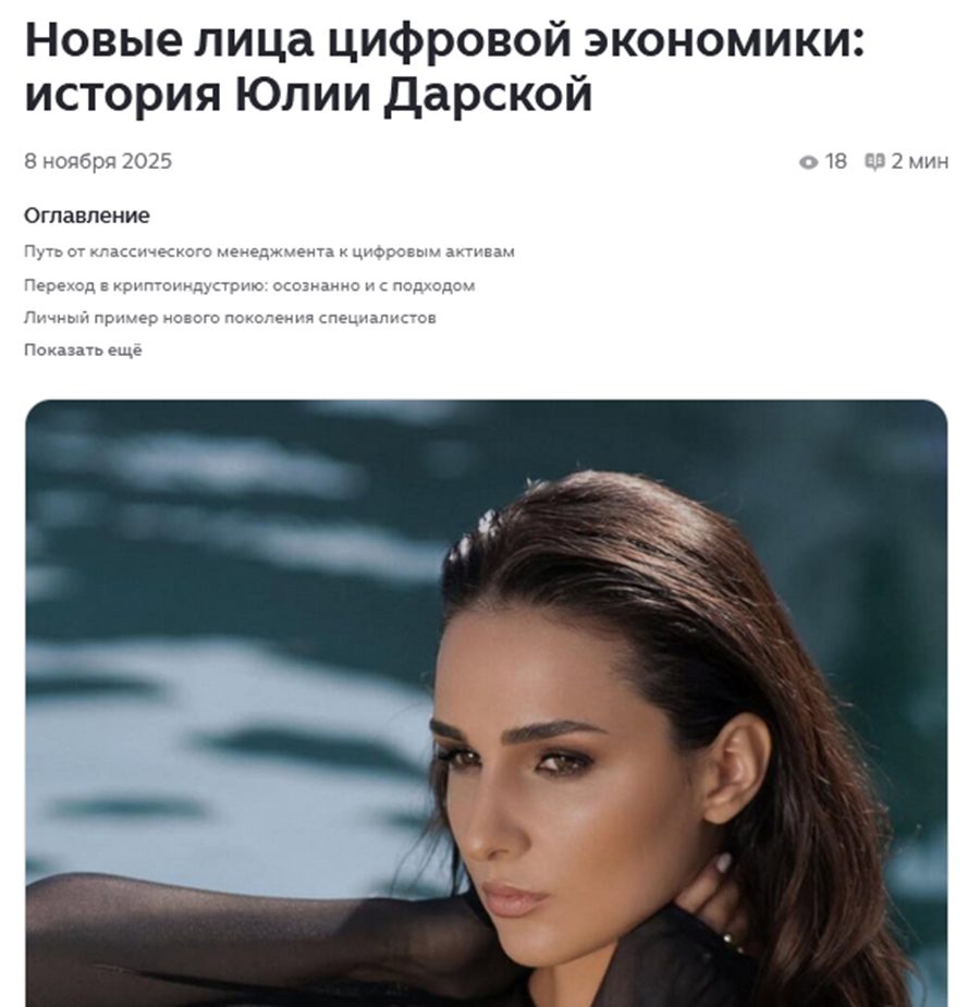 Первая статья на Дзене вышла 8 ноября 2025. Это история о том, как неопытная девушка прошла путь от новичка до лица цифровой экономики. В статье указано, что Юлия родилась 14 ноября 1995 в Сочи. Она окончила ВУЗ по специальности менеджмент, затем начала работать в салоне Эстель на должности администратора. Это дало ей возможность научиться взаимодействовать с клиентами и персоналом, принимать решения. Но уровень дохода был недостаточный и Дарская приняла решение о заработке в сфере криптовалюты.
