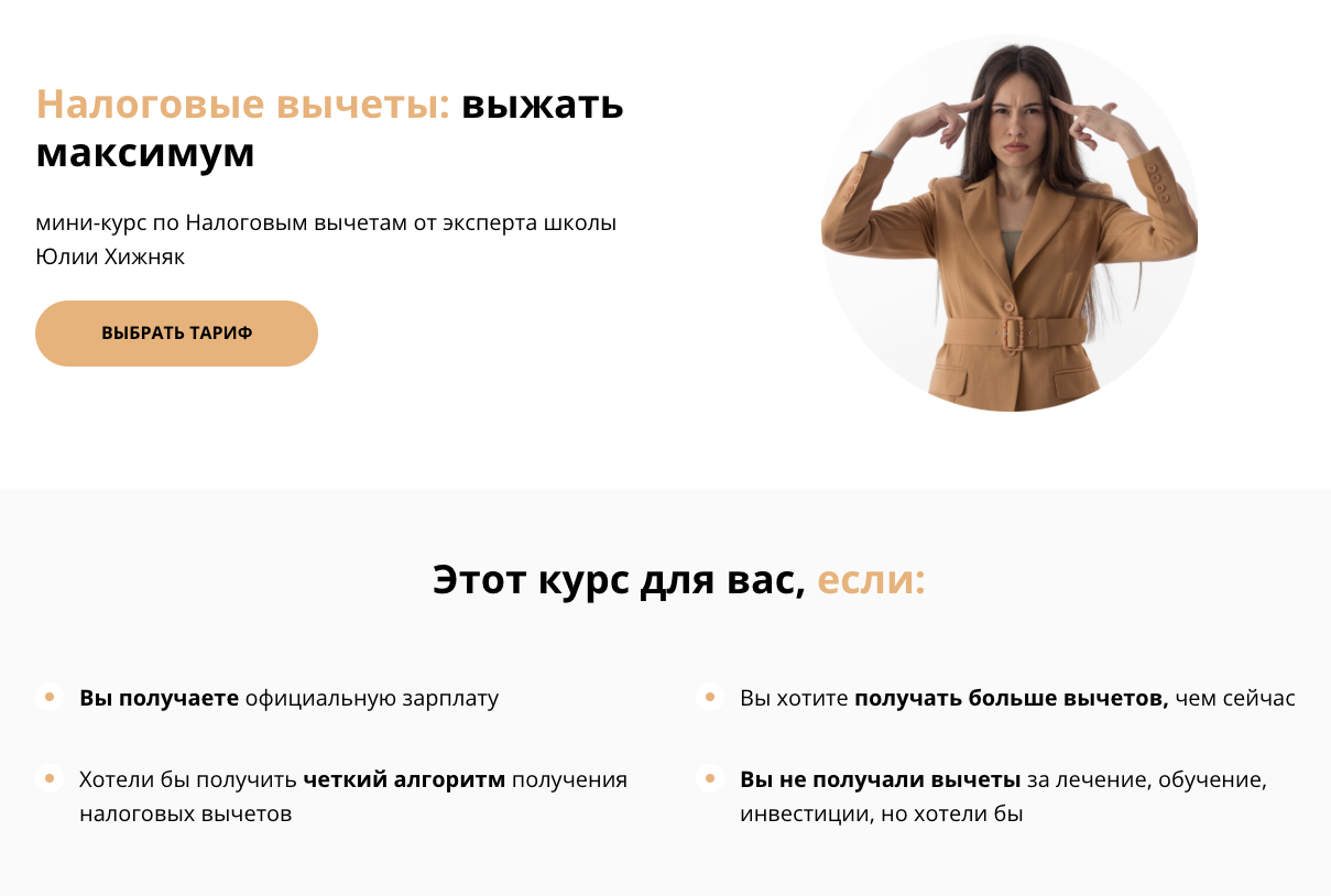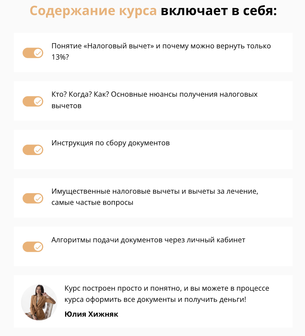 Собственный курс Хижняк Юлии называется «Налоговые вычеты. Выжать максимум». Он ориентирован на людей, которые работают официально, и при этом хотели бы оптимизировать объемы отчислений государству.
