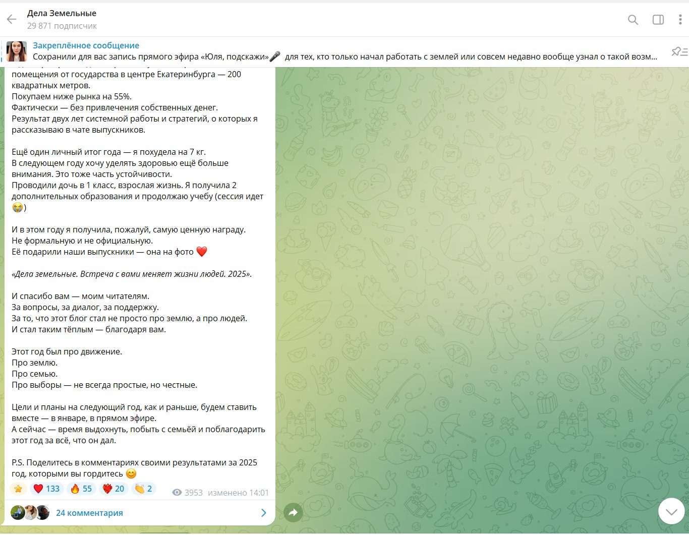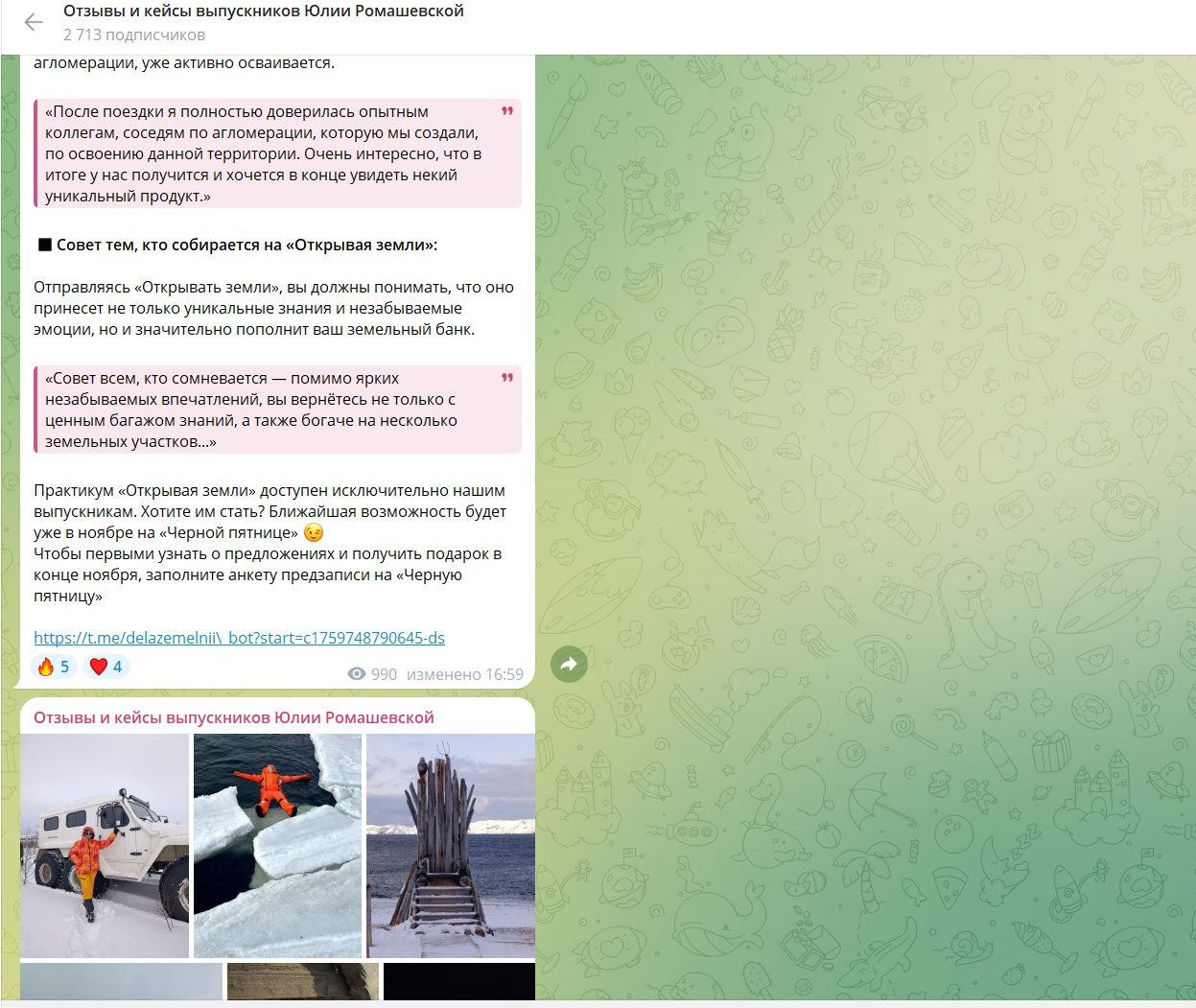 Для тех, кто хочет пройти курс «Дела земельные», Юлия Ромашевская отзывы собрала в отдельном канала в ТГ. Она предлагает заработать на земле и инвестициях в нее. На сторонних ресурсах мало что слышно о проекте, и мы решили выяснить, не мошенники ли это.