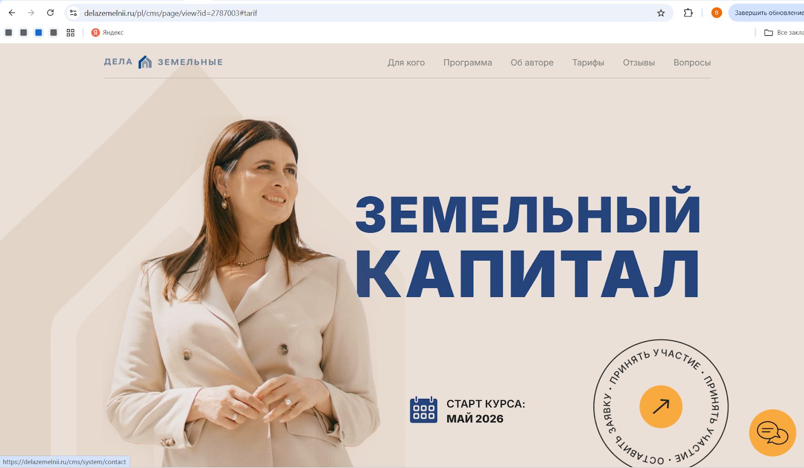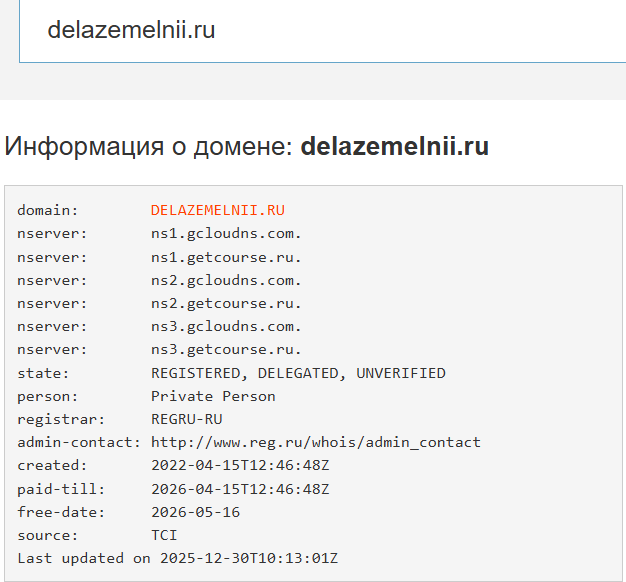 На сайте Delazemelnii ru есть информация об авторе, курсе «Земельный капитал», и немного написано об условиях сотрудничества. Проверка показала, что домен создан в 2022 году, тогда же, когда и ИП.