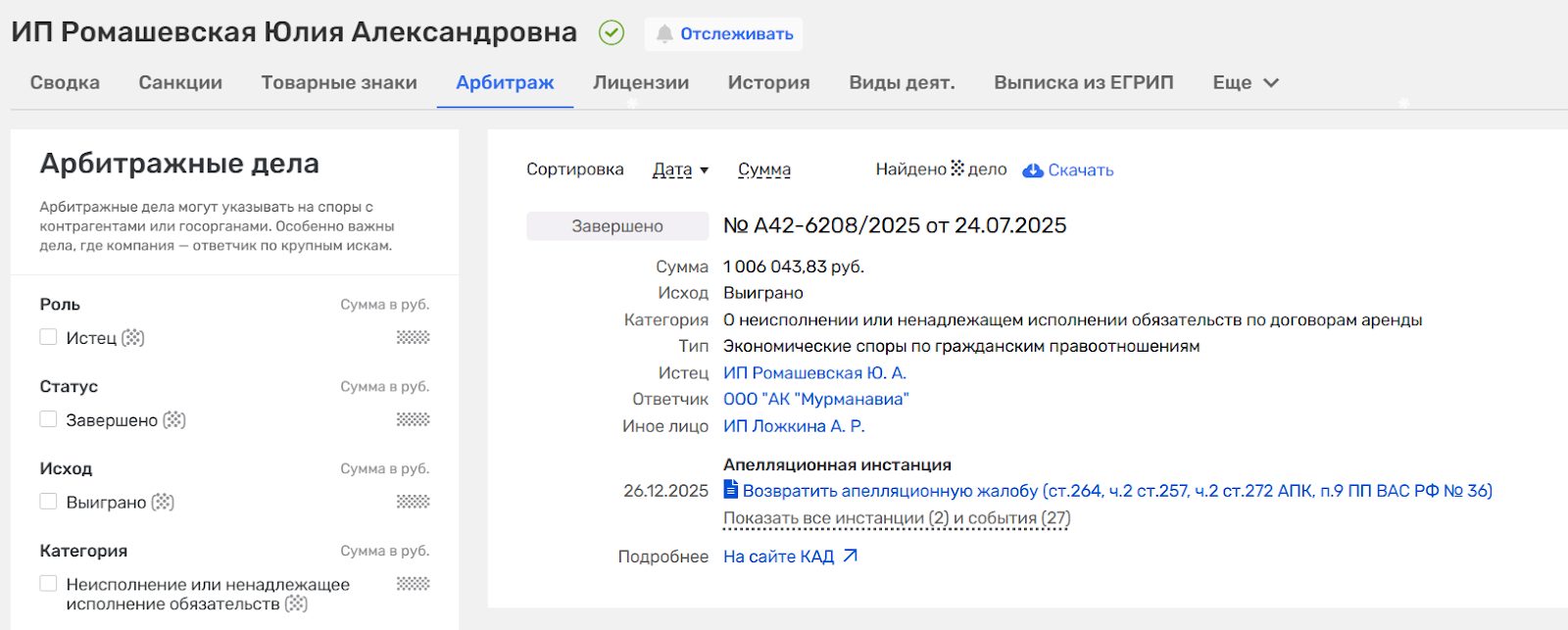 Также у девушки есть ИП Ромашевская Юлия Александровна, отзывов о нем найти не удалось. Свой бизнес она ведет только с 2022 года. У него несколько направлений деятельности, включая недвижимость и выращивание овощей и зерновых культур. Инвестор участвует во всем, что касается земельных участков, продажи и аренды, в том числе у государства.